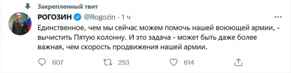 Расскажите кто-нибудь Рогозину, что никакая российская армия в Украине не воюет. Отдельные части просто проводят гуманитарную миротворческую миссию, вот и все. В результате этой миссии из Украины уже более 3 миллионов беженцев (причем не в Россию, которая типа как страна-спаситель от жидобендеровцев), практически уничтожены несколько украинских городов и погибли сотни жителей Украины. Также миротворцев украинская армия положила как минимум несколько тысяч человек - чтобы уже не миротворили и не гуманитарили. А войны-то никакой и нет. Неужели Рогозин не в курсе? А Пятую колонну - конечно, обязательно надо вычистить. Это даже важнее, чем скорость продвижения их армии, которая, по-моему, как-то не особо и продвигается, потому что в Украине получает люлей по полной программе и еще немало получит. Но Рогозину, судя по всему, об этом так и не рассказали. Бывает, да.