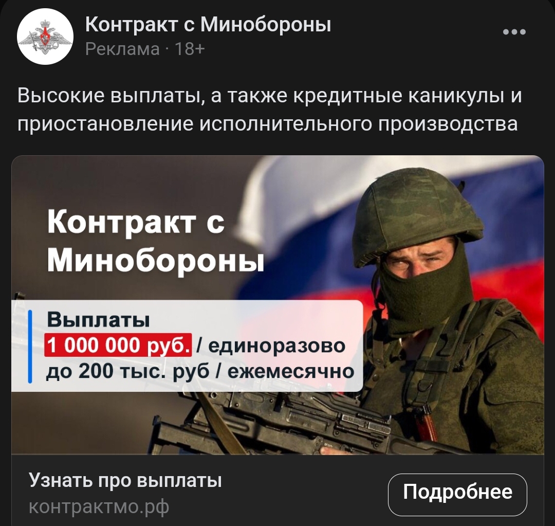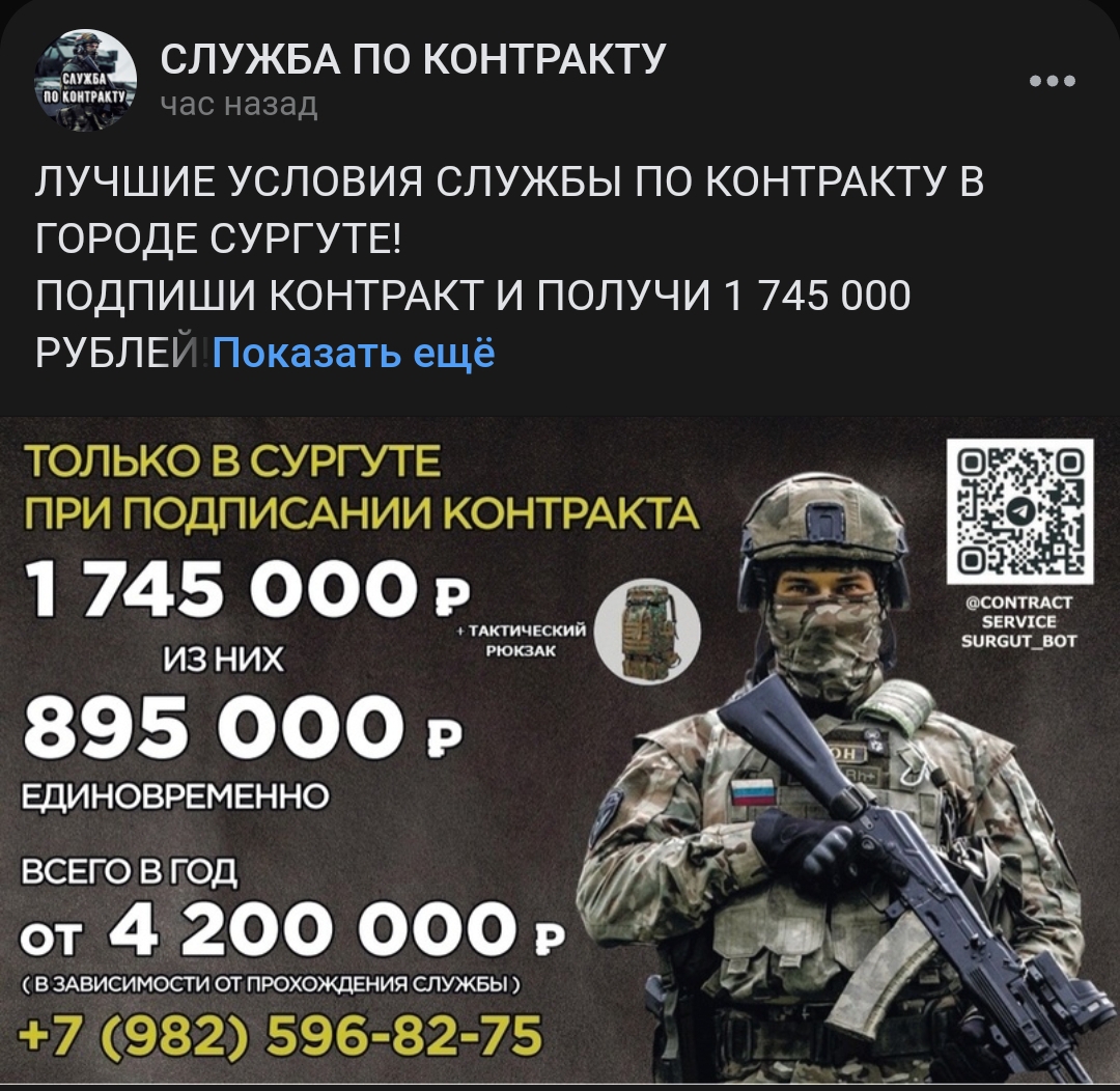 Видимо, это несусветные деньги не только в глубинке, или, как любит выражаться Верховный, в регионах. Но есть нюанс. У моей мамы в Питере есть соседка, которая ей иногда помогает по мелочам за небольшую плату. Ее муж, долго перебивавшийся разными занятиями типа таксиста, устал от этого и записался воевать. Убили его примерно через месяц.