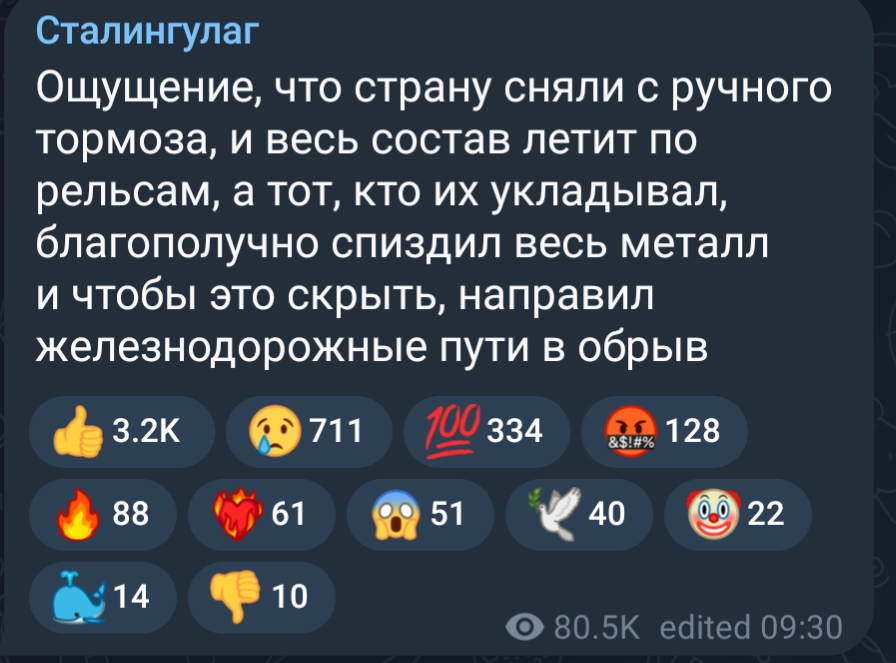 В ближайшее время большинство из 25 млн резерва (это около 35% трудовых ресурсов страны) будет думать только о том, как бы забрали не его (то есть время будет идти не на работу, а на нервное грызение ногтя, переезд на другую квартиру, где не найдут, уход с работы, на которой найдут, поиски знакомств в военкомате, получение липовых медсправок, попытки устроиться на оборонное предприятие и пр.). Большинство руководителей бизнесов страны будет озабочено не работой, а способами сохранить персонал или на худой конец найти замену потенциальным потерям. Большинство из 100 млн членов семей резервистов будут сильно хуже работать от стресса и помогать своим мужьям/братьям/сыновьям грызть ногти, переезжать, искать кому дать взятку и где купить справку.