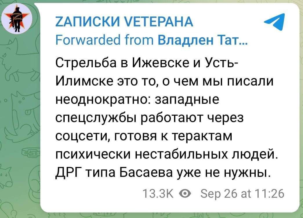 "В ижевскую школу ворвался маньяк и убил пять детей и четырёх взрослых. Увидев, что он натворил, маньяк в ужасе застрелился из карабина, которым убивал детей.