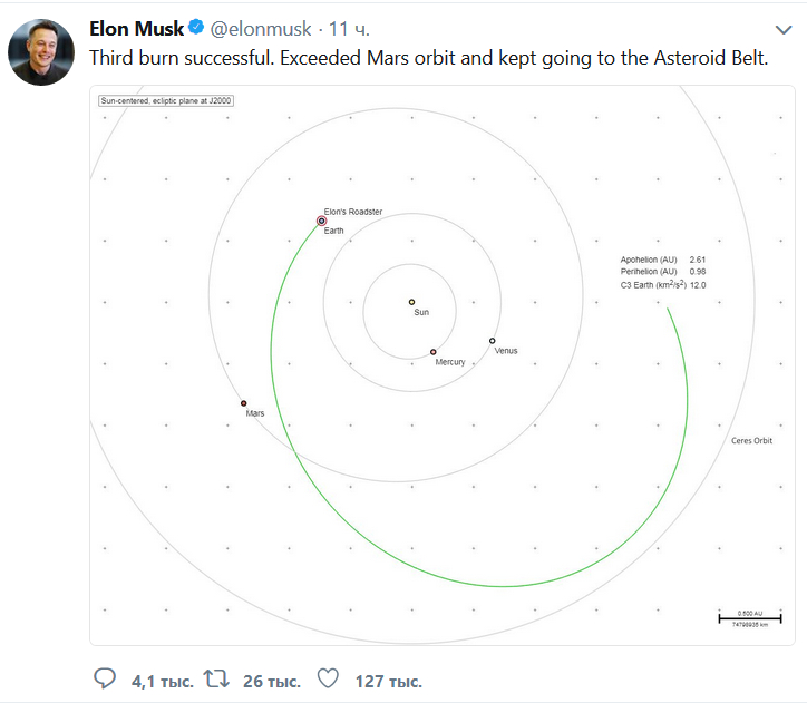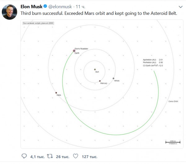 В эксклюзиве "Эха" ракета Маска уже пересекла орбиту Марса и на полных парах движется к "поясу астероидов". Шустрая какая ракета, я и не знал, что наличие Tesla на борту ее так ускоряет.