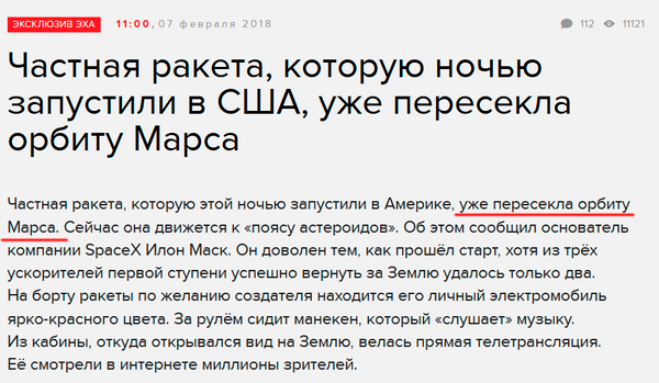 Но ясный пень, у Маска речь идет о траектории движения ракеты, а не о самой ракете. Головой-то подумать можно, что никакая ракета за ночь до орбиты Марса не долетит. Даже с "Теслой" на борту.