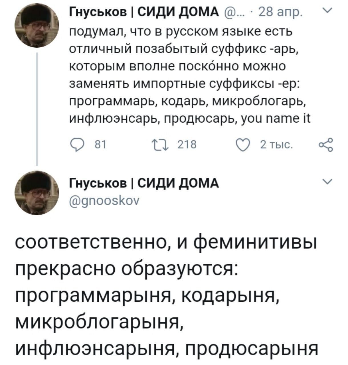 Поэтому нет никакой возможности и необходимости лепить искусственные феминитивы в язык.