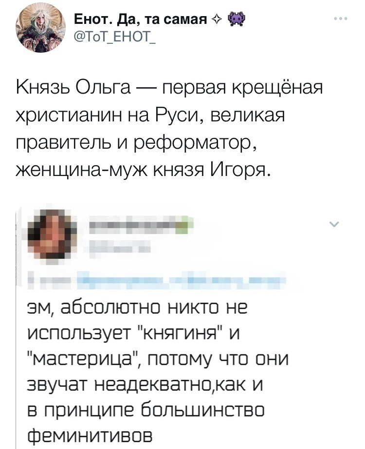 Так что я теперь, вполне возможно, буду использовать феминитивы для обозначения различных профессий в русском языке. Но только профессий. Потому что "членкиня" - нет, на это я уж точно пойти не могу.