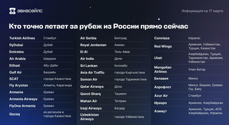 Ну и вот список тех авиакомпаний, которые летают из России сейчас.