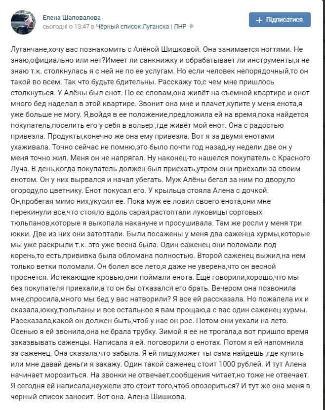 Совершенно эпичная история, прям готовый сценарий фильма с закосом под "Оскар". И заклинаю вас, господа, не связывайтесь с енотом Алены Шишковой, ни к чему это! И прям Елену Шаповалову жалко: она по доброте душевной согласилась помочь, а теперь у нее ни тюльпанов, ни хурмы, ни юкки. Усе погрыз проклятый енот! Но переживаю по поводу енота Елены Шаповаловой. Как он там, интересно? И как он пережил то, как ловили второго енота? Может, они успели подружиться, и это было для него трагедией.