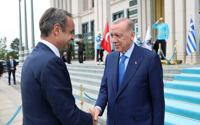 Президент Турции Эрдоган приветствует премьер-министра Греции Мицотакиса
