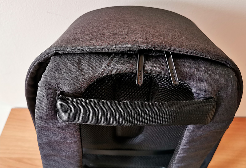Лямки рюкзака сверху скреплены поперечной ручкой, за которую рюкзак очень удобно держать в руке. На спинке есть специальная лямка для крепления на ручку чемодана.