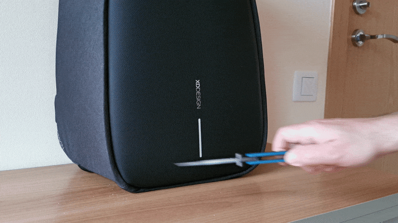 А если взять рюкзак в руку, то когда он висит на уровне коленки, порезать его незаметно, мне кажется, сложно.