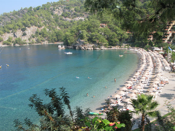 А местный "тихий пляж" - изобретение просто гениальное! Идти туда пять минут - обогнуть холм по дорожке вдоль моря. Места всегда есть (народу в отеле уже немного, так как конец бархатного сезона). Мамаш с детьми нет, мобильники не звенят, музыки нет, аниматоров нет как класса, никто не орет - почти полная тишина и только плещет чистейшее море. Чистоты оно необыкновенной, чему способствует галечный пляж и все остальные условия. Вот кадр, сделанный с шезлонга, на котором я сижу.