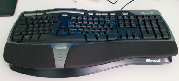 После того, как научился печатать не глядя на клавиатуру, в полный рост встал вопрос об эргономичной клавиатуре. И моей первой была Microsoft Natural Multimedia keyboard . Однако, был разочарован - очень часто во время набора подклинивали клавиши (в итоге клаву выбросил). И так бы я и остался обиженным на мелкомягких за выброшенные 60 долларов, но на работе мне купили новый комп беспроводным набором Microsoft Natural Ergonomic Desktop 7000 . И вот это, скажу я вам, было совсем другое дело. Ничего лучшего я до сих пор не пробовал. И хотя в ней есть маленький дефект (1 раз из 5 не срабатывает клавиша с цифрой 2 в верхнем ряду) и абсолютно угробищная мышь (которой я, скрипя зубами пользовался несколько лет, пока совсем не достала), до сих пор её пользую и очень доволен.