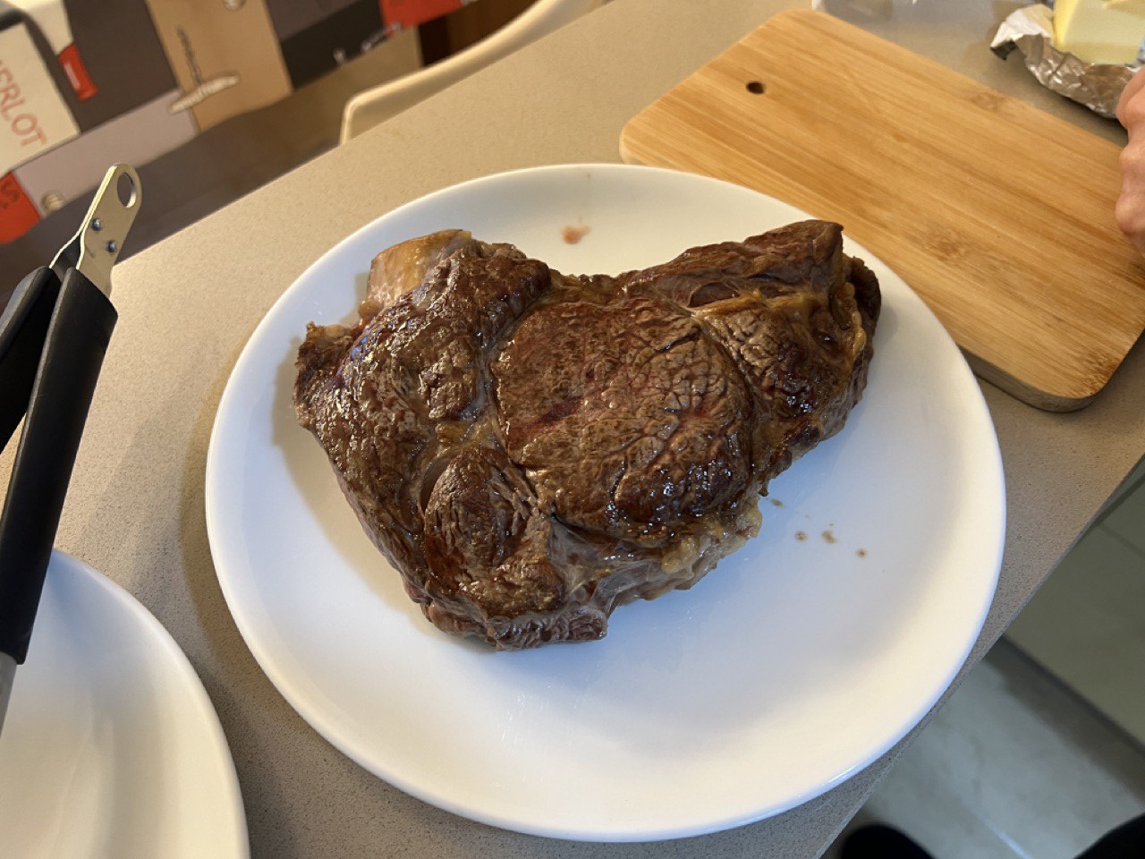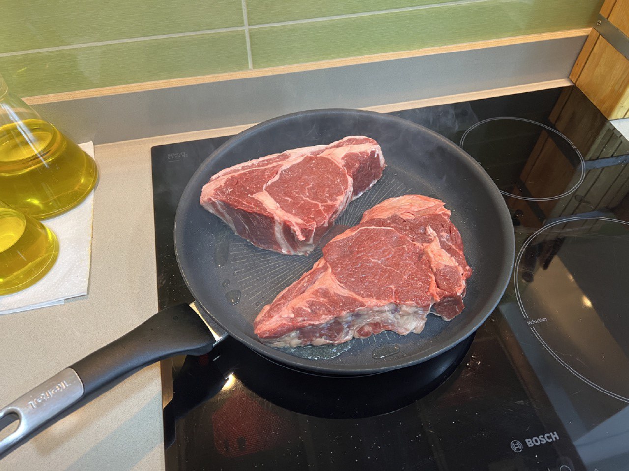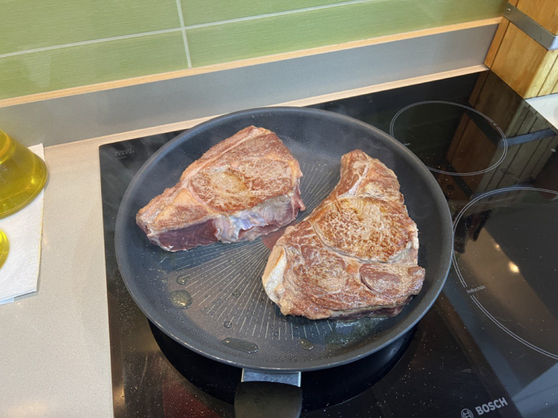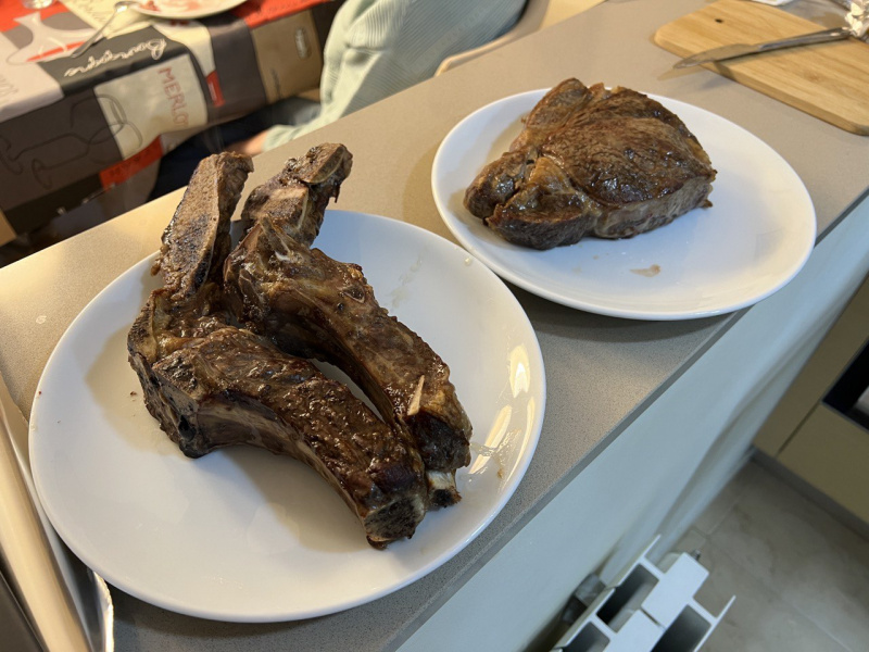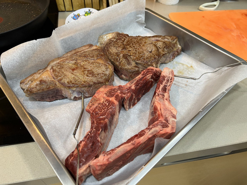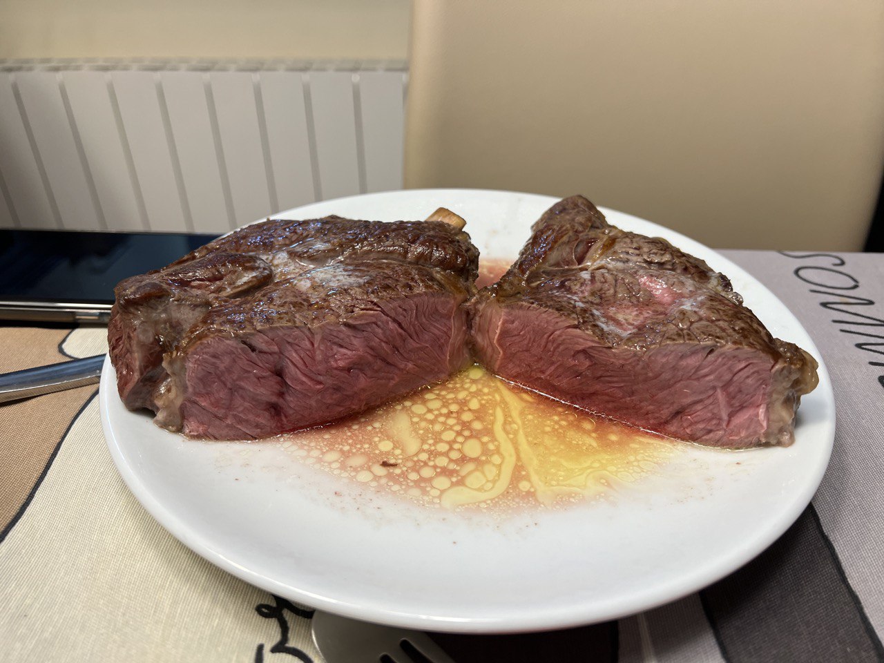 По поводу приехавшего мяса. Зажарили вчера два чулетона. По стандартной технологии: сначала доведенные до комнатной температуры чулетоны (достал из холодильника за 3 часа до готовки) "запечатали" по минуте на стороне на разогретой сковородке хорошей теплоемкости, после чего в духовку на 200 с термометром: доводить до температуры 55 градусов. Что интересно, у двух не сильно отличающихся по толщине кусков разница в температуре была аж 18 градусов. В итоге первый чулетон мы вытащили, а второй в духовке оставался еще минут 15.