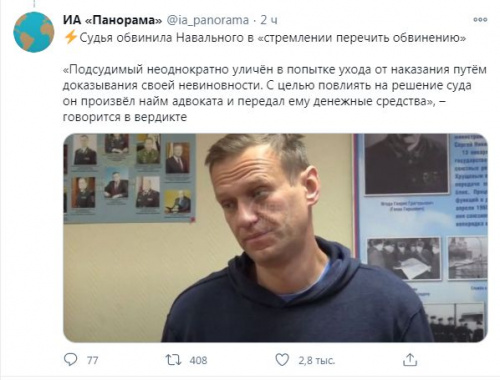 Алексей Навальный заключён под стражу на 30 суток до 15 февраля 2021 года
