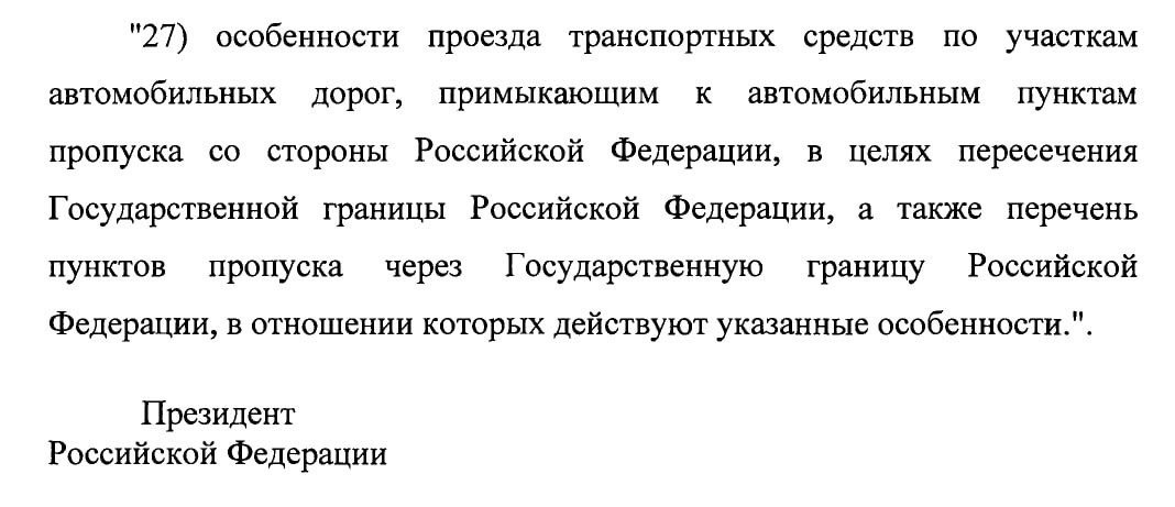 "Проезд транспортных средств, принадлежащих российским перевозчикам, иностранным перевозчикам, гражданам России, иностранным гражданам, лицам без гражданства и другим по участкам автомобильных дорог в целях пересечения государственной границы РФ осуществляется в зарезервированные дату и время в соответствии с порядком, установленным правительством РФ", - указано в документе.