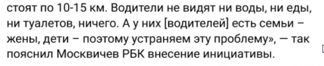 "Водители не видят ни воды, ни еды, ни туалетов, ничего" - почему-то на той же финской стороне они всё видят. И воду, и еду, и то, и сё. И (био)туалеты для них на обочине ставят. Даже если они вдоль трассы чёрти на сколько стоят.