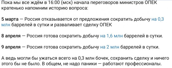 "...Начнем с того, что Россия, которая 3 года состояла в соглашении ОПЕК+ все 3 года практически не сокращала добычу нефти. Она играла показателями — зачет попутного нефтяного газа, коэффициенты пересчета тонн в баррели и т. д. Все это понимали, саудиты это видели, но закрывали глаза - им нужна была сделка и не нужен скандал, чем Россия нагло пользовалась. Однако терпение саудитов подходило к концу. И все взорвалось, когда Москва стала капризничать по поводу очередного - совершенно необходимого — ограничения добычи...." newizv.ru