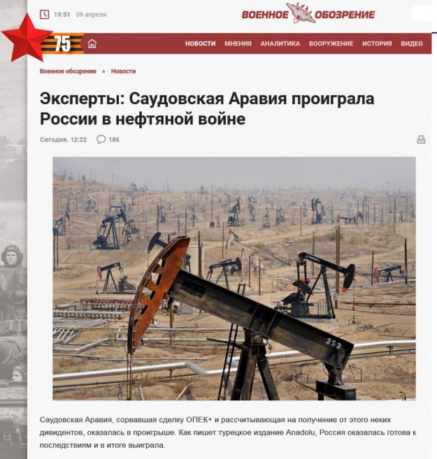 Шестого марта Россия не согласилась с предложением ОПЕК+ сократить ежедневную добычу нефти на 0,3 млн бареллей в день и разорвала сделку. Это было мудрое, продуманное и дальновидное решение, после которого саудиты начали "нефтяную войну" и обрушили цену на нефть.