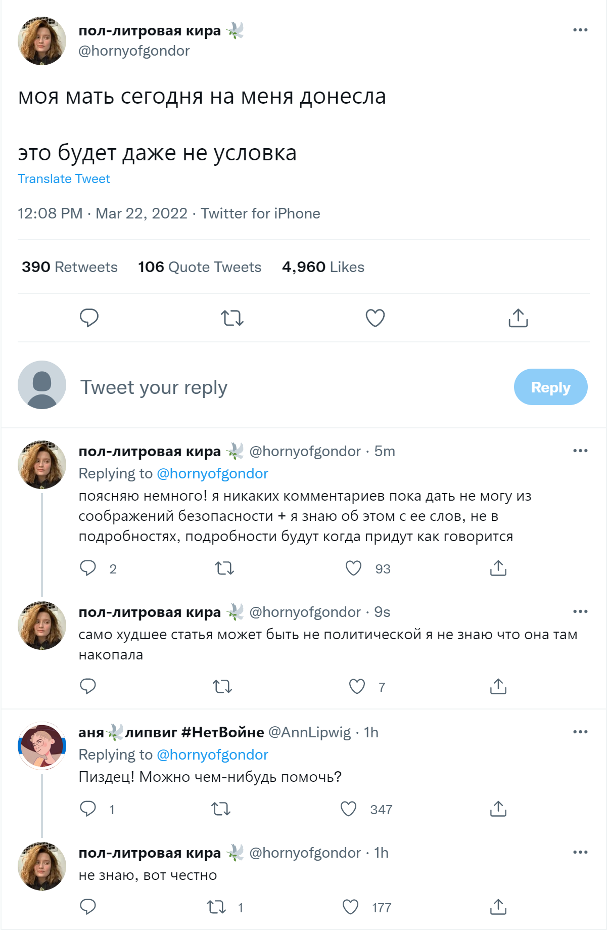 "Нас много. Мы обязательно справимся. Мы сможем остановить ту ужасную несправедливую войну, которую начал наш президент", - уверяет она. (Отсюда.)