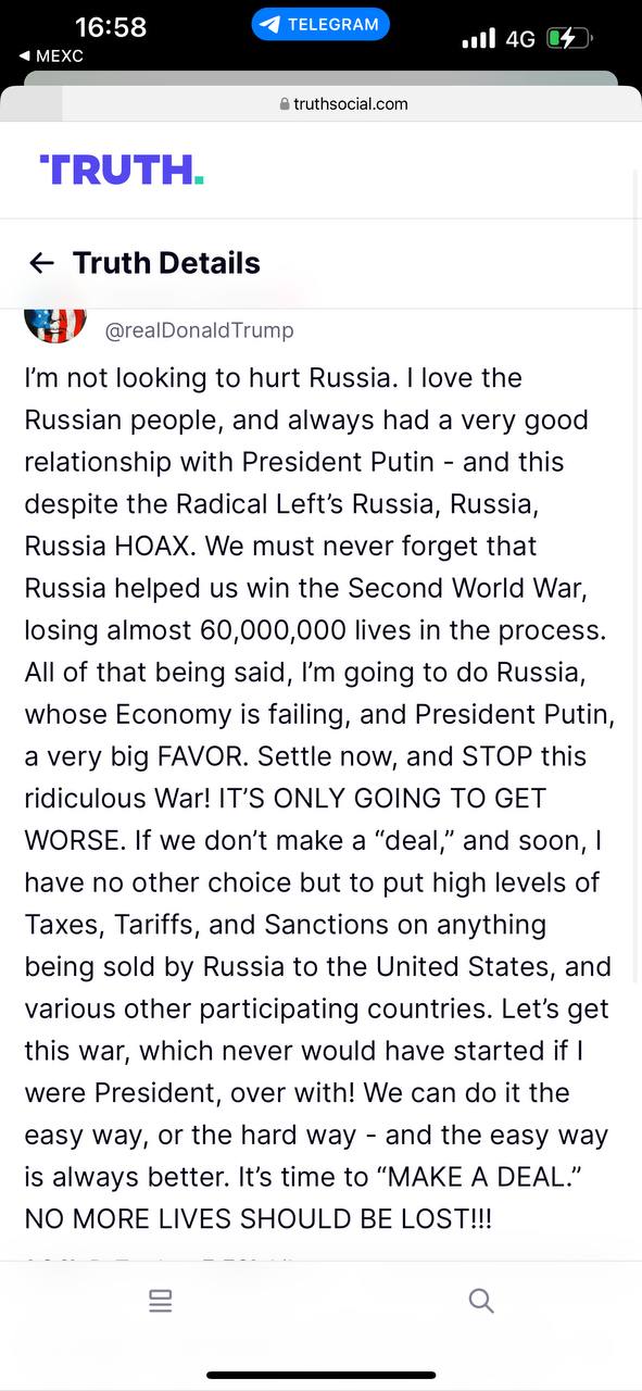 1. Все боялись, что Трамп будет давить на Украину, однако мы видим его первое обращение в виде ультиматума к россии и путину. Не к Украине.