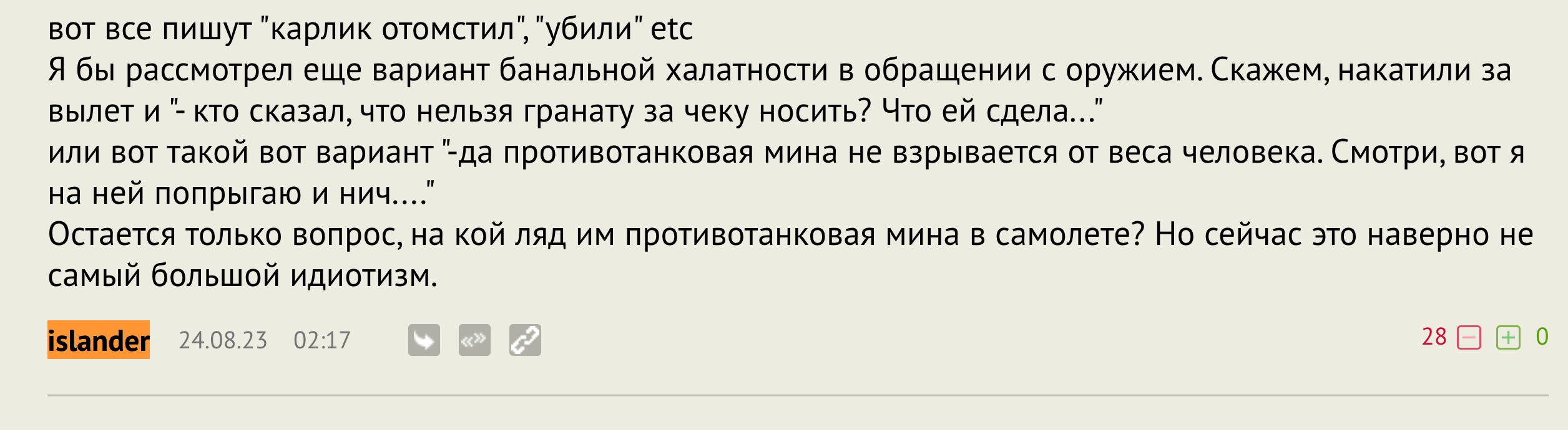 «…в этой авиакатастрофе погибли два Героя Великой России. Ну мало ли кто забыл, а не нарики. И с оружием они были не на ты даже, а на иди сюда нах@й. Версия про самоподрыв это смех и фарс», - тг-канал "Южный фронт».