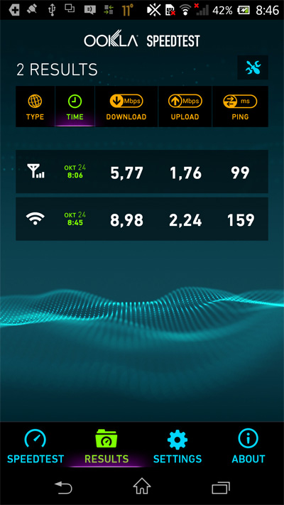Вот замеры: первый - при использовании карты в смартфоне, второй - при использовании в роутере. У меня домашний ADSL меньше выдает.