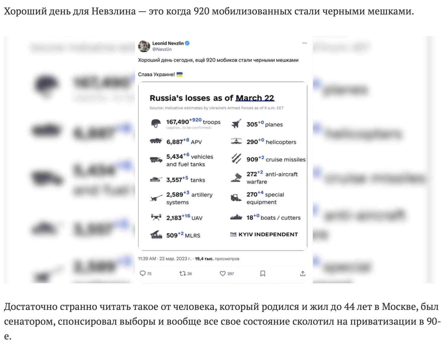 По остальному могу согласиться. Но тут-то. Вы что, как и Романова фильм не смотрели? Напрасно. А я вот посмотрел, не поленился. Об этом там говорится. И, ради интереса с видео (открываю для себя гугл ленз, прикольная штука, как-то я его не пользовал раньше) распознал ссылки на два твита из переписки. Один процитирован якобы Невзлином. Второй взят из переписки Невзлина с Певчих (то есть вроде как аутентичное). Оба твита принадлежат ноунейму и содержат обвинения в адрес Невзлина. Т.е. как минимум то, что для Невзлина ноунейм таковым не является, это факт. И что Невзлин его не очень, скажем так, любит, тоже. Т.е. в поехавшую кукуху человека вы поверить можете, а в том, что этот человек может причинить вред кому-то к кому испытывает взаимную личную неприязнь - это уже в высшей степени сомнительно? Ну, ок.