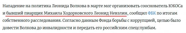 ФБК обвиняет Леонида Невзлина в том, что это он, мол, заказал нападение на Леонида Волкова, организовал нападение на Ивана Жданова, экономиста Максима Миронова и его жену.