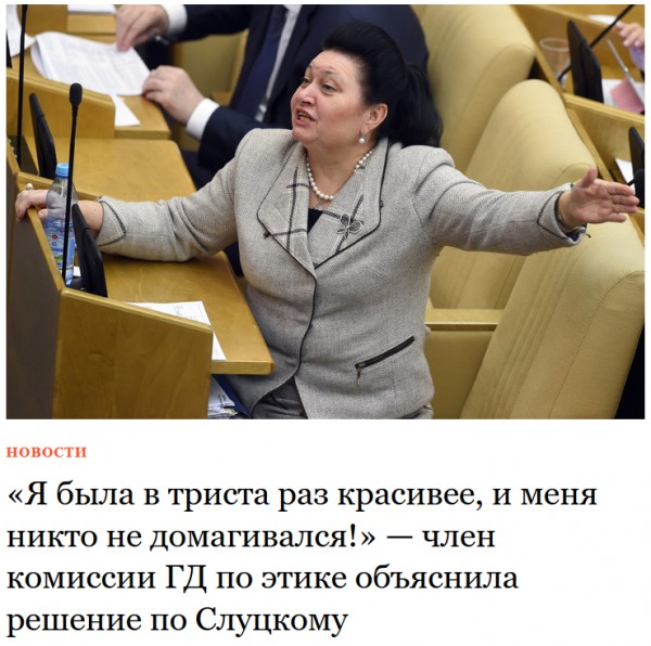 Все таки Слуцкого надо еще раз вызвать на комиссию по этике. Рядом с ним находится депутат, в 300 раз красивее, а он ее до сих пор не того. Что за избирательность такая?