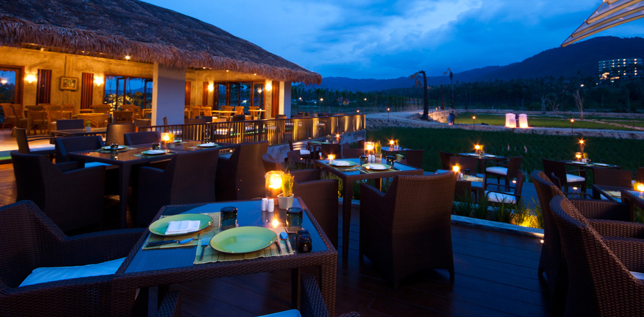 Столики в основном стоят на улице в окружении рисовых полей - антураж такой. Горячие влажные полотенчики для рук (признак крутого ресторана) принесли свернутыми в виде зайчиков.