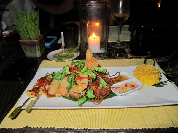 Слева направо - шашлычок из курицы, два пирожка с овощами, два узелка с овощами, два крутона из хвороста непонятного мне происхождения. Красивый цветок справа оказался несъедобный, о чем мне поведали очередные сломанные ползуба. Он высечен из цельного куска какого-то очень твердого овоща.