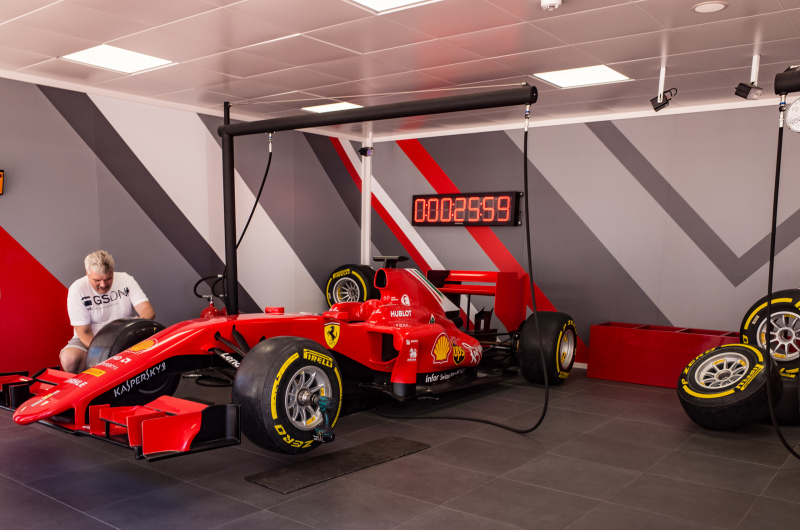 Аттракцион "Почувствуй себя техником команды Ferrari". Получаешь оборудование, меняешь колеса на скорость.