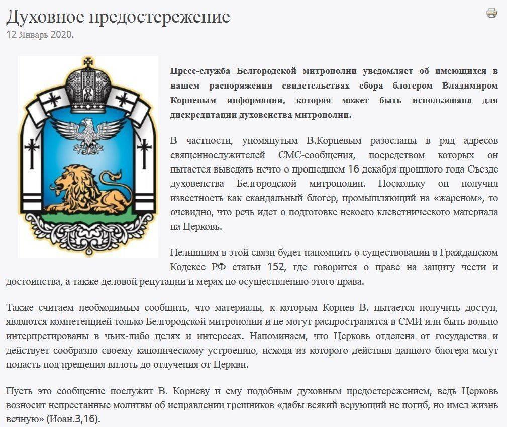 Ну и так далее. То есть история-то простая. В редакцию поступила информация. Журналист решил проверить данные. После чего получил вот такое "Духовное предостережение".