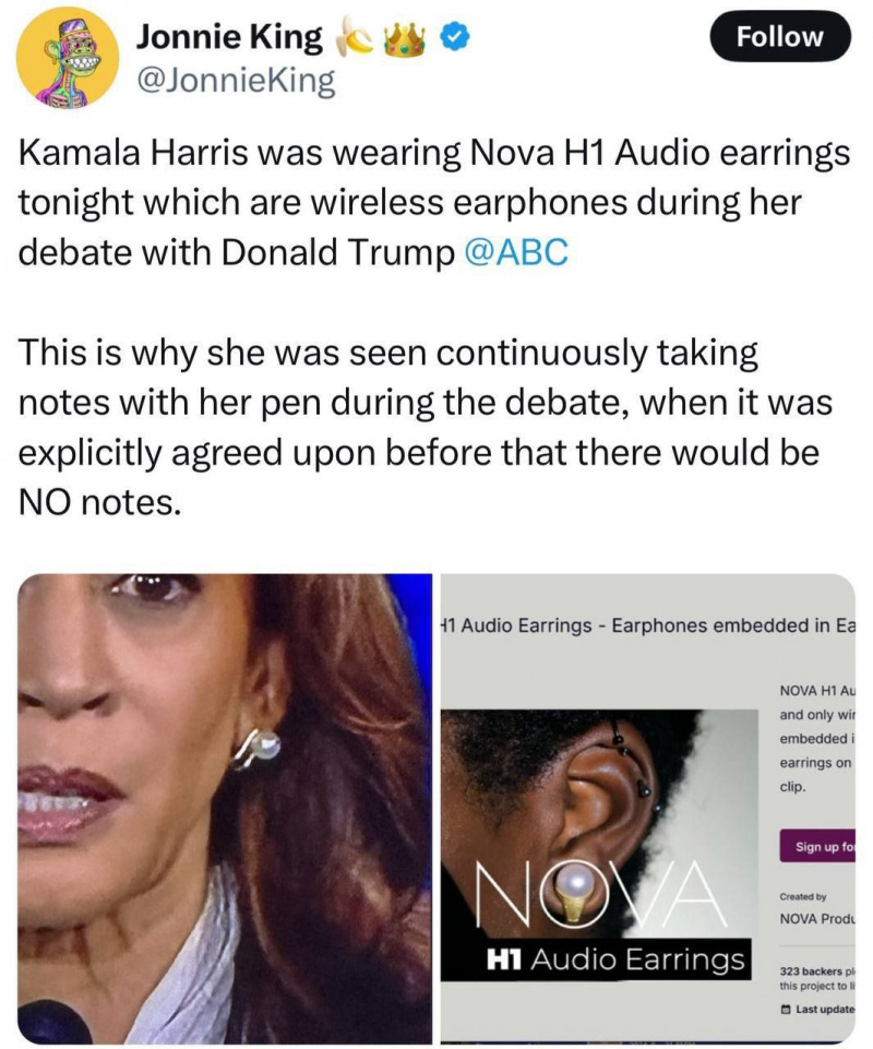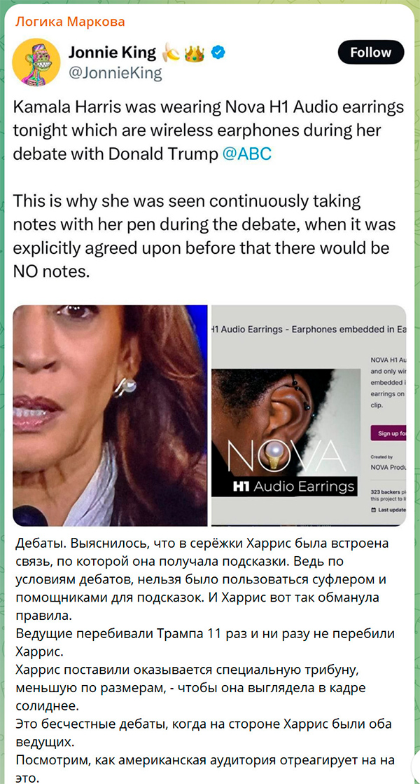 Сторонники Трампа разгоняют нелепую дешевку о том, что, мол, у Камалы Харрис во время дебатов был наушник в сережке. И "доказывают" это картинкой, по которой хорошо видно, что они нагло врут.