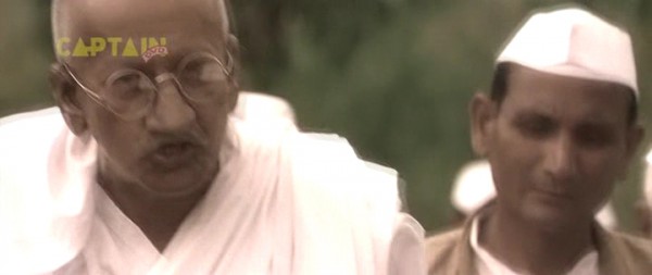В этот момент Махатма Ганди в Индии делится с простыми людьми своей мудростью, и его снимают на камеру.