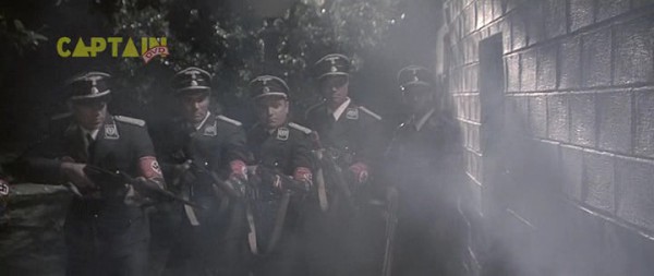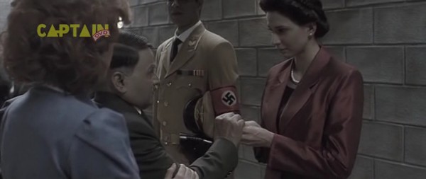 В коридорах бункера массовка изображает знаменитую сцену из фильма "Бункер".