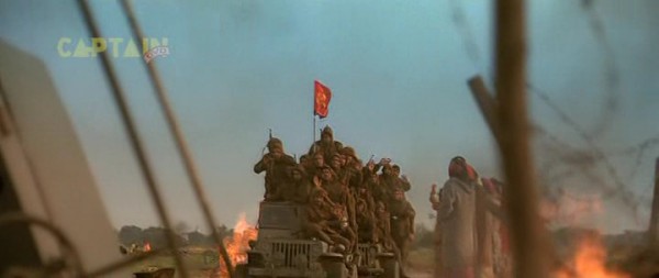 Советские войска все на той же машине снова входят в Берлин. Благодарное женское население в платочках встречает их стройными рядами.