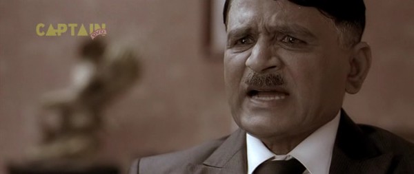 Бункер, 1945 год. А тут и Гитлер нарисовался. Колоритный такой. Росточком с сидящую собаку, в цивильном костюмчике с галстучком (он в основном в нем почти весь фильм и проходит). Прикол в том, что актеру Рагувиру Ядаву на его седые волосы нацепили брюнетистую нашлепку с косым проборчиком, а из-под нашлепки выглядывает его седина. Смотрится это, конечно, колоритно, но предельно нелепо. К тому же всю глубину переживаний фюрера Ядав изображает таким взглядом, как будто Гитлер страдает многодневным запором. И этот взгляд не меняется у него на протяжении всего фильма - большого дарования актер, большого дарования.