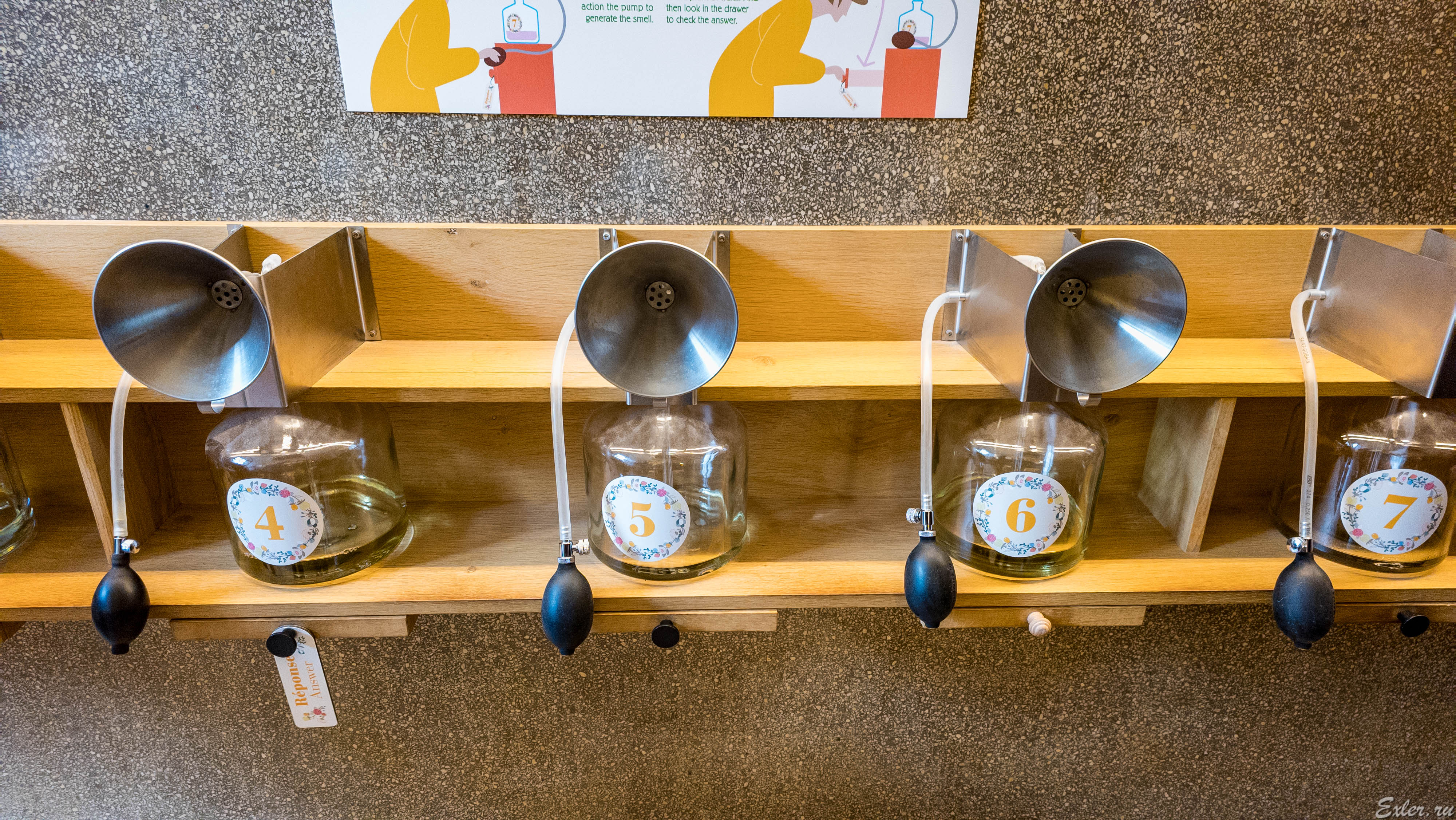Аттракцион "лото ароматов" в музее. Нажимаете на грушу, вдыхаете аромат (например, фиалок или цитрусовых), пытаетесь угадать. После этого открываете ящичек снизу и смотрите правильный ответ.