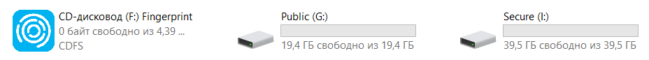После этого в системе при подключении флешки будут появляться три диска: диск с программой, публичный раздел и секретный. Причем секретный появится только тогда, когда вы запустите программу Fingerprint Tool и пройдете идентификацию отпечатка. Без этого будет виден только публичный раздел. Скорость записи на секретный диск практически не отличается от скорости записи на публичный.