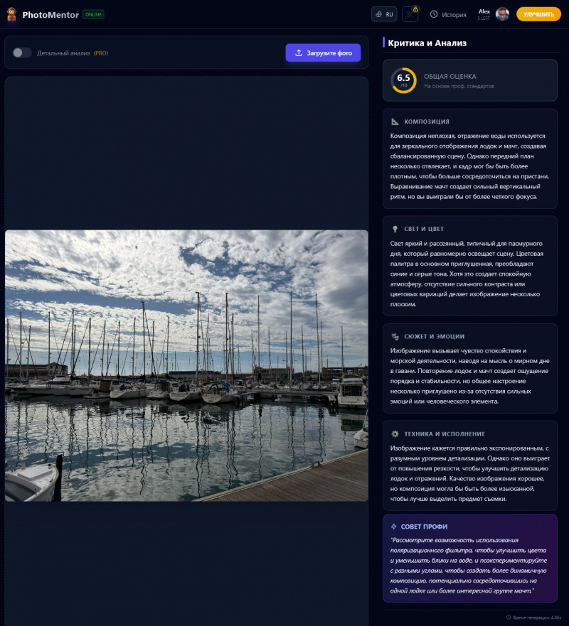 И такой сервис есть (мне на него ссылку прислал разработчик сервиса) - PhotoMentor. Загружаете фото, он анализирует, а потом выдает общую оценку, свои замечания и советы. Вообще прикольно, я его сначала погонял на паре приличных фоток, а потом туда загрузил совсем скучную и неинтересную - из тестов смартфона. Вот что он в итоге выдал.