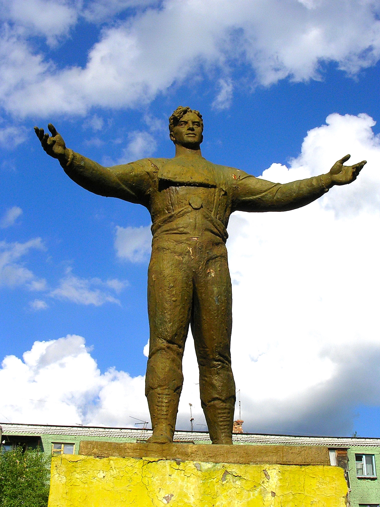 Гагарин был военный лётчик. Он улетал в космос на корабле из тугоплавких металлов, из нержавеющей стали, его окружали антенны, бесчисленные приборы. Он был рулевой, управлявший космической машиной. За его кораблём тянулся огненный шлейф сгоревшего топлива.