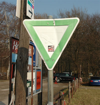 А вот дорожные знаки у них иногда бывают очень неожиданные. Вот, например, вот такой странновато-зеленый выезд то ли на главную дорогу, то ли в лесопарковую зону...