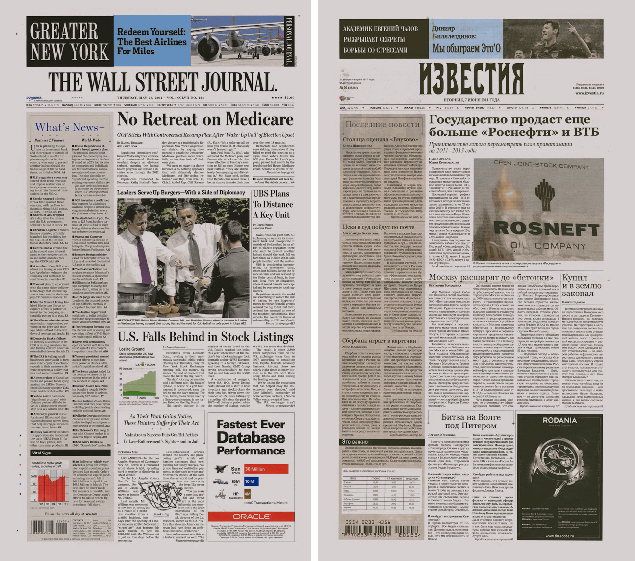 Газета "Известия" - солидное издание. У них наверняка есть дизайнер, который занимается макетом, и не один. А раз солидное издание, то и макет должен быть солидный. Правда, его нагло сперли у The Wall Street Journal один в один, но кого вообще волнует этих глупостей, правильно?