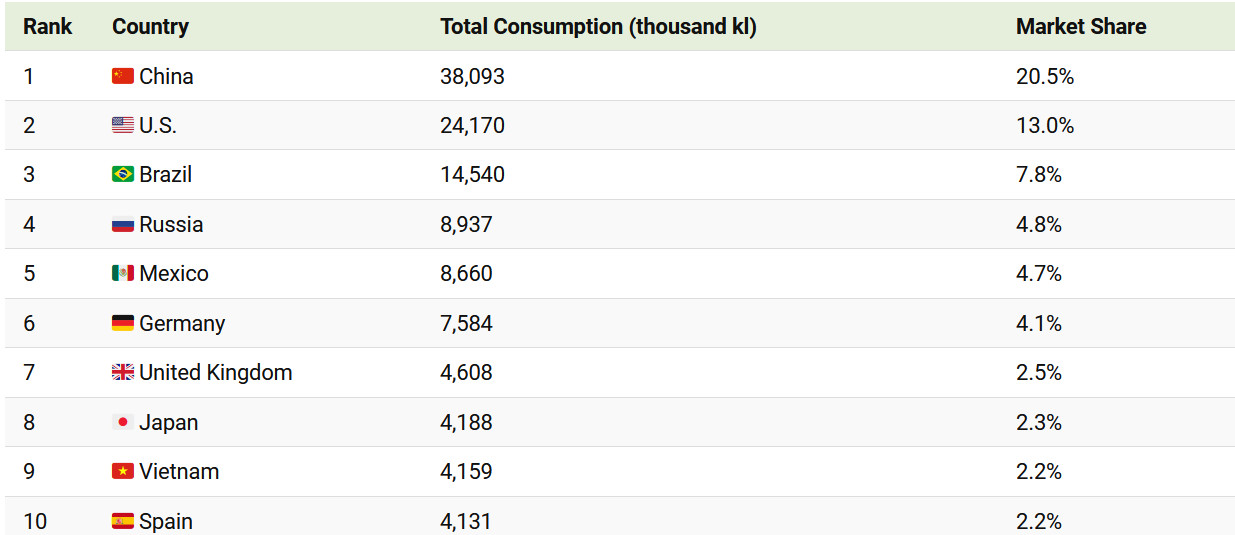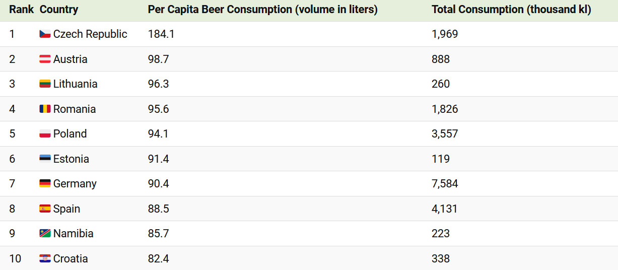 Ну и намного более интересная табличка - потребление на душу населения, так хоть сравнить нормально можно. Чехия тут в два раза обогнала всех, ну и заметьте, что Испания с Германией - на соседних местах. Испания вроде считается "винной" страной, но здесь действительно пьют много пива.