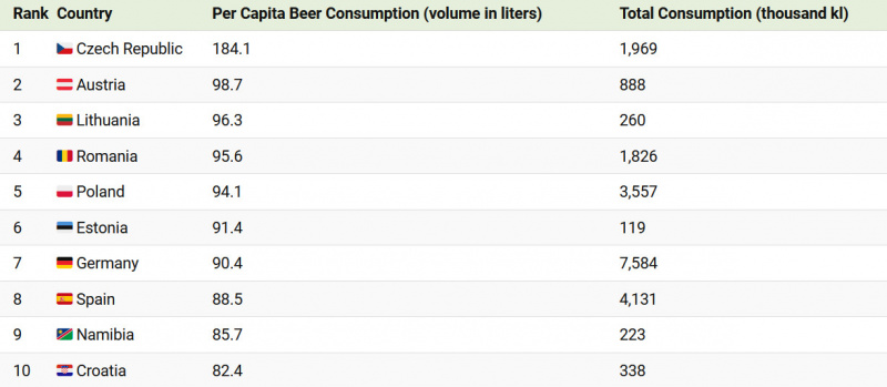 Всегда забавляла такая статистика и её адекватность. Я живу в Эстонии и у нас большую кассу по пиву делают приезжие финны. А ещё они часто покупают пиво на пароме в tax free, это как какой из стран засчитывается? Сам я пью много пива но на 95% делаю его сам и знаю ещё пару человек, кто делает пиво сам. Уверен, нас эта статистика не учитывает вообще.