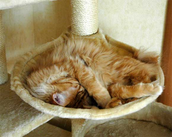 У меня кот (тоже, кстати, рыжий) постоянно так спит, на подоконнике. А в этом "гнезде" по-другому и не ляжешь.