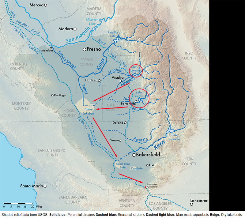 Очень странная статья. Мне потребовалось пару кликов, чтобы получить информацию об этих озерах и дамбах. Они связаны с Южной Калифорнией сложной системой акведуков. Неужели, эксперт по водным ресурсам Бэрри Нельсон о них не знает? Более того, в Википедии написано, что именно для того, чтобы в сезон дождей избежать наводнений, воду периодически сливают в озеро Туларе (Tulare Lakebed).