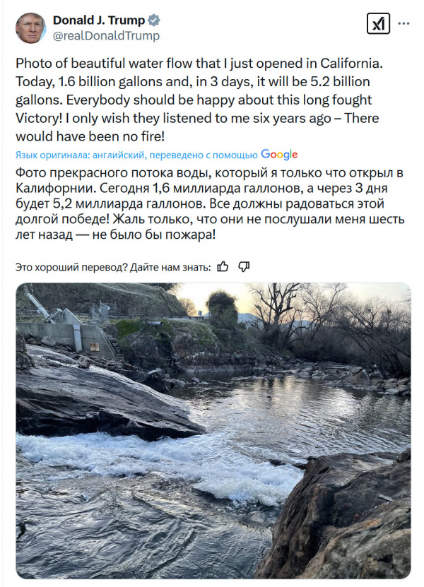 В прошлую пятницу Трамп X-уякнул пост, в котором он показал фото "прекрасного потока воды", который должен принести в Калифорнию 5,2 миллиарда галлонов воды. И написал, что это нужно было сделать еще шесть лет назад - мол, тогда никаких пожаров бы не было.