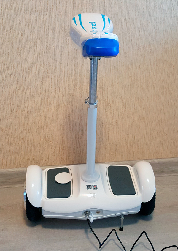 Ну и все, гироцикл готов к использованию. Остается только его зарядить: полная зарядка с нуля продолжается порядка трех часов. У скутера есть специальная подножка, благодаря которой гироцикл стоит ровно в вертикальном положении при выключенном движке.