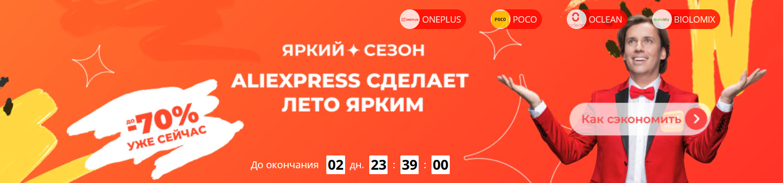 Сейчас на Aliexpress идет главная распродажа лета, которая называется "Яркий сезон". Закончится распродажа 26 июня в 09:59 по Москве. Как обычно, делаю пост со всякими промокодами и ссылками, чтобы вы в комментариях могли делиться своими находками и промокодами.